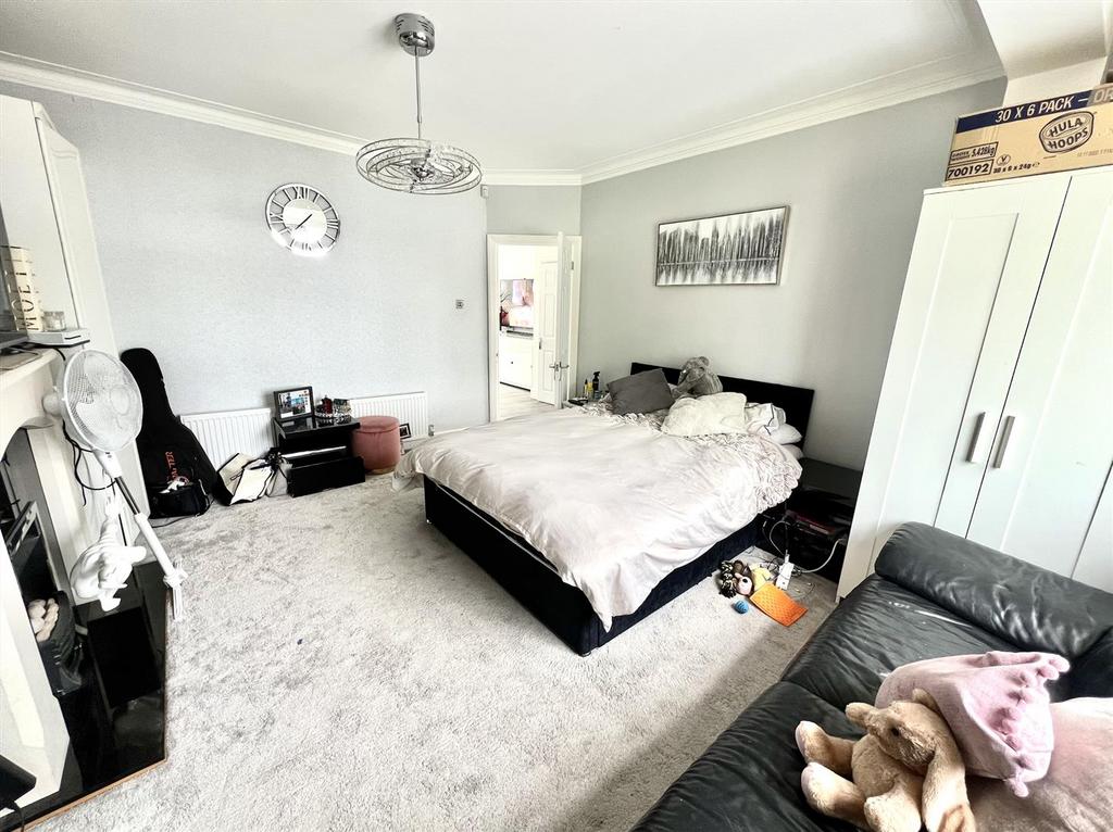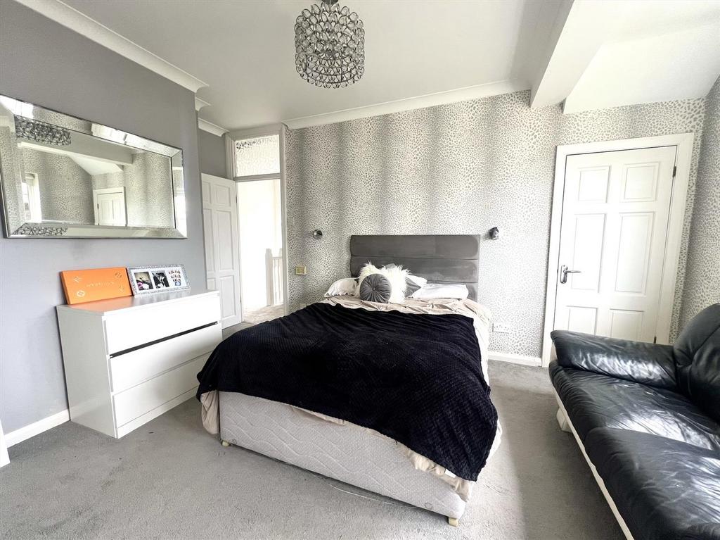 Master Bedroom - 4.47 x 3.02 (14'7" x 9'10") - This master bedroom features: Dark grey patterned wallpaper, white ceiling, one ceiling pendant, built in walk through wardrobe, light grey carpet, double glazed windows over looking the garden and allowing a lot of natural sunlight, crystal chandelier, white wooden door, small door on the wall leading to a storage area and plenty of plug sockets.