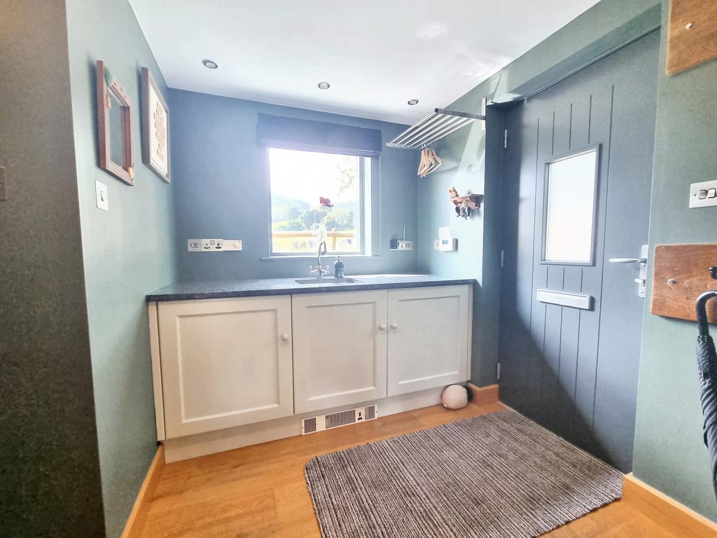 UTILITY ROOM (3.30m x 2.60m approx)(10'10" x 8'7" approx) with oak flooring, built-in cupboards with granite worktop and 'Franke' sink with mixer tap. Spaces and plumbing for washing machine and dryer. (Available as an option). Power points, ceiling lights and rear window. Side entrance door to driveway.