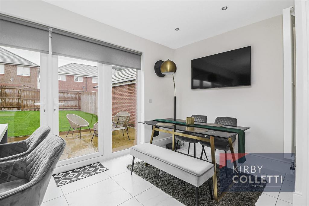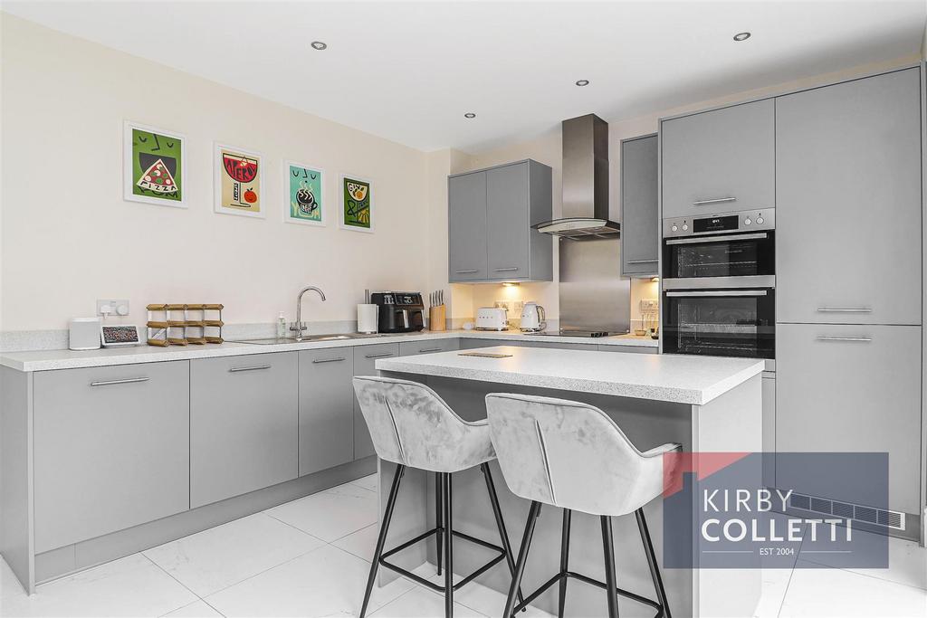 Kitchen/Breakfast Room - 5.51m x 3.45m (18'1 x 11'4) - Rear aspect full height windows and double doors to garden. Grey wall and base units with work surfaces over. Island unit with breakfast bar and pop up electrical point. Plumbing for dishwasher. Built in double oven. Integrated fridge freezer. AEG induction hob with extractor canopy above. TV and aerial point. Recessed ceiling spotlights. Porcelain tiled floor.