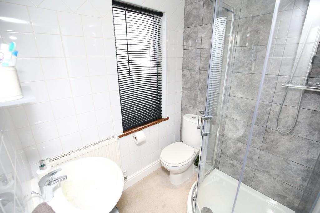 ENSUITE 5' 7" x 4' 9" (1.7m x 1.45m) Opaque double glazed window to front aspect, recessed ceiling down light and extractor, single panelled radiator, low level WC, pedestal wash hand basin, corner tiled shower cubicle having a chrome mixer shower with rainfall style shower head, tiled walls.