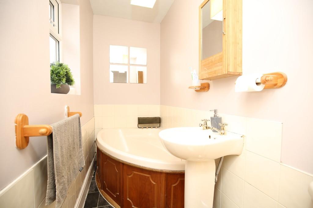 BATHROOM 8' 2" x 3' 4" (2.49m x 1.02m) Opaque double glazed window to side aspect, pedestal wash hand basin, corner low level WC, corner panelled bath and tiled splash back areas.