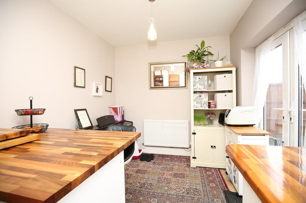 BREAKFAST KITCHEN 14' 8" x 8' 6" (4.47m x 2.59m) Double glazed French doors leading out to the rear garden, double glazed window to rear aspect, double panelled radiator, fitted base and eye level units, walnut work surfaces, Belfast style sink, inset stainless steel electric double oven, gas hob with an extractor hood above, breakfast bar, space for a washing machine and fridge freezer, tiled splash back areas.