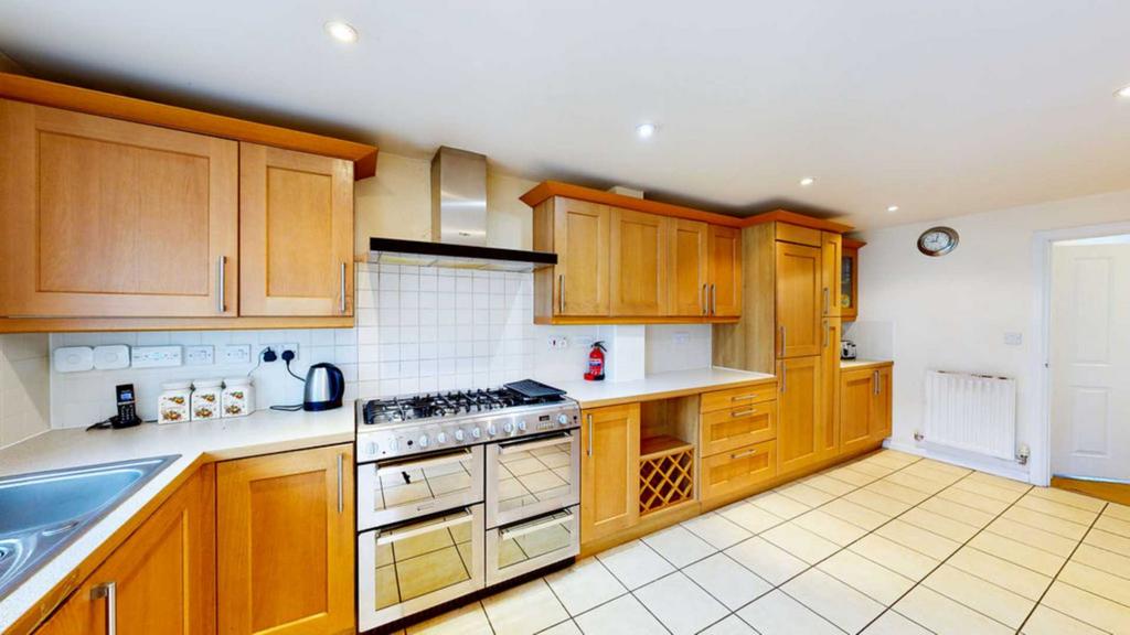 A good selection of base and wall units with worktops and stainless steel sink with mixer tap, splashback tiles, Hotpoint range style cooker with 7 ring gas hob with plate warmer, oven and grill, overhead extractor, integrated fridge/freezer, dishwasher and washer/dryer. Wall mounted boiler in housing. Double glazed window and door to rear. Tiled flooring. Under stair storage cupboard. Space for dining table and chairs.
