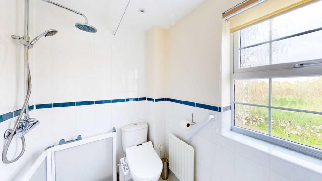 Wet room with non-slip flooring and moveable shower screens, thermotic shower with controls and shower attachment also an overhead shower, low level smart toilet with bidet wash function, heated seat and dryer. hand wash basin Radiator and double glazed obscure window to front. Extractor fan.
