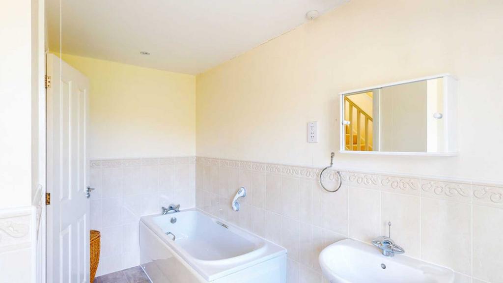 Vinyl flooring, white panelled bath, shower cubicle with shower attachment, low level smart toilet with bidet wash function with heated seat and dryer, hand wash basin, radiator and double glazed obscure window to front. Part tiled walls. Extractor fan.