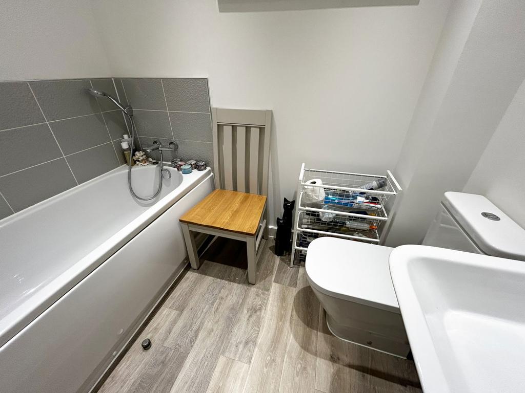 Contemporary Family Bathroom Being fitted with a three piece white suite comprising; panelled bath with wall mounted mixer tap and shower attachment, low flush WC and wall mounted wash hand basin, with tiling to water prone areas, shaver socket, fitted vanity mirror, LVT flooring, obscure double glazed window to side, radiator and spot lights to ceiling