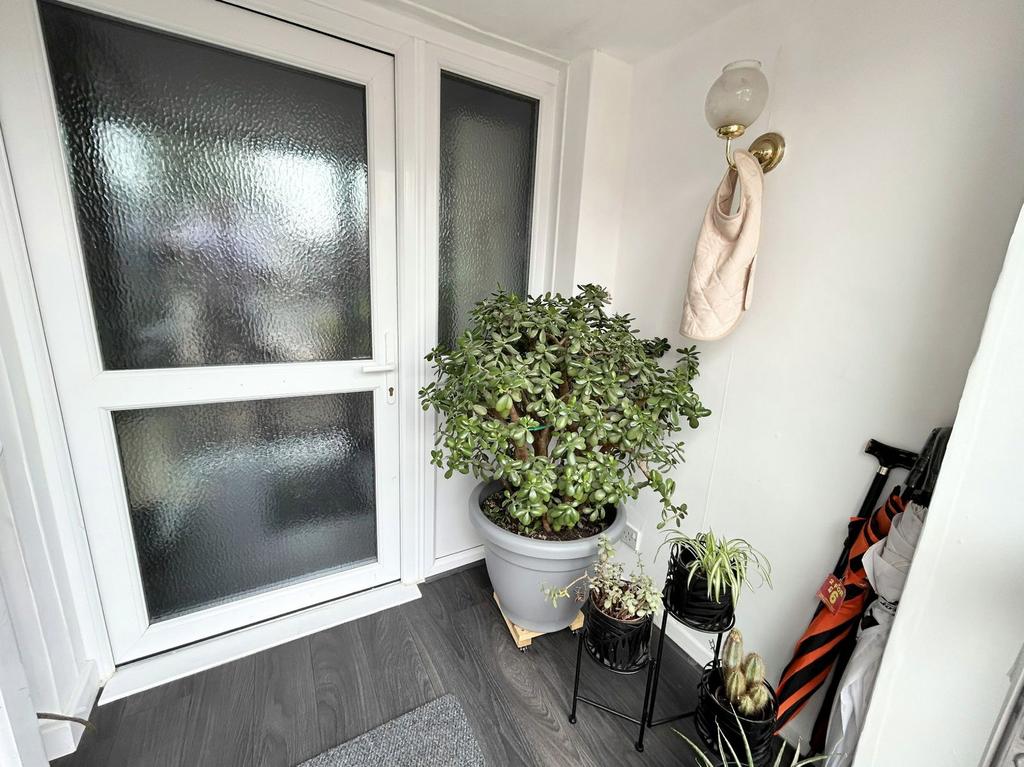 Enclosed Porch With obscure double glazed windows, radiator, lighting, wood effect flooring and obscure glazed door leading through to