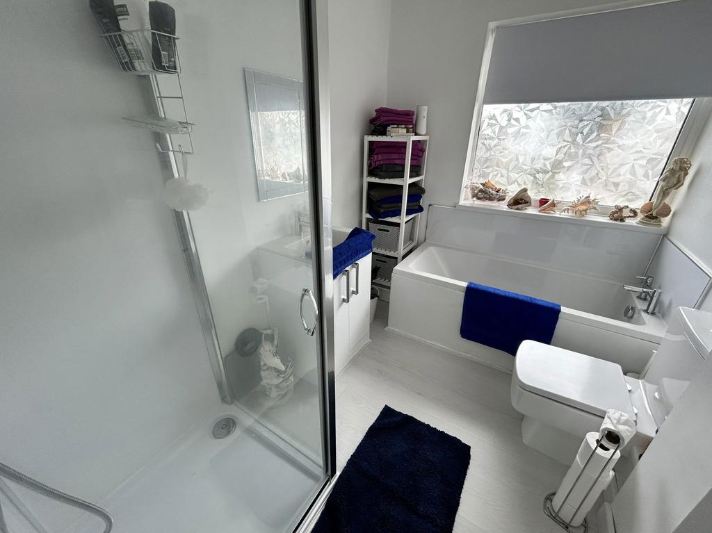 Re-Fitted Four Piece Family Bathroom to Front Being re-fitted with a four piece white suite comprising; panelled bath, low flush WC, vanity wash hand basin and shower cubicle with tiling and aqua-panelling to water prone areas, wood effect flooring, obscure double glazed window to front and ceiling light point