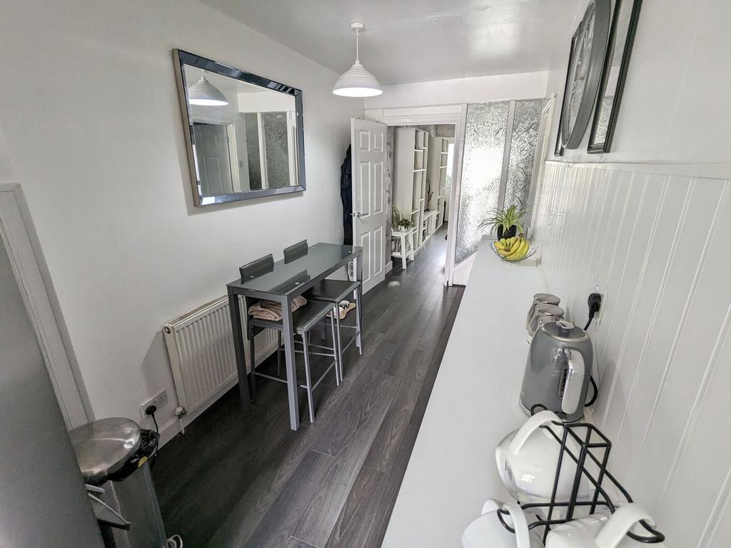 Rear Inner Hallway With radiator, ceiling light point, wood effect flooring, opening through to breakfast kitchen and door to