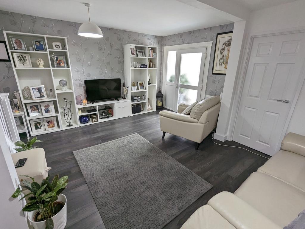 Open Plan Lounge 15' 11" x 16' 7" (4.85m x 5.05m) With double glazed window to side elevation, two ceiling light points, obscure window to front, open plan staircase, radiator, wood effect flooring, door to rear inner hallway and door to