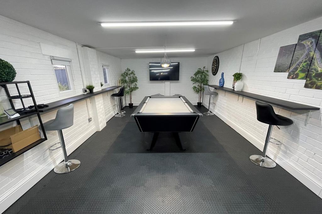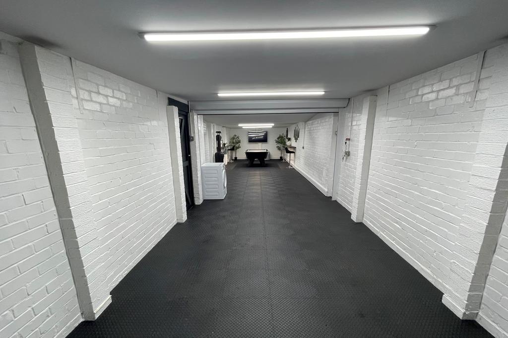 SUPERB EXTENDED GARAGE (2019) 54' 5" long x 10' 11" wide (16.59m x 3.33m) electric roll-over door widening to 12' 1" (3.68m) 2nd electric roll-over door, power, light, 2 uPVC double glazed windows & PVC door to rear garden.