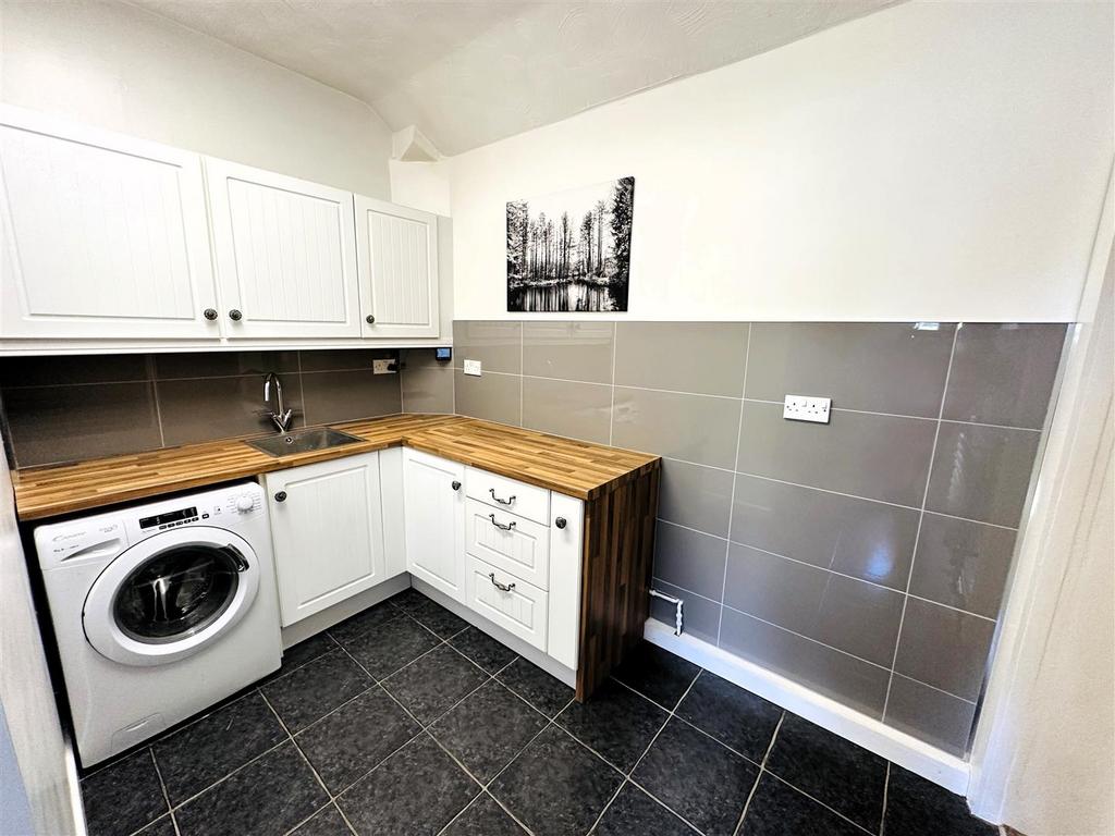 Utility - 3.11m x 2.97m (10'2" x 9'8") - Range of white fronted base and wall units with pewter twist handles. Single bowl stainless steel sink inset to wood effect laminate work surface with tiled splashback.