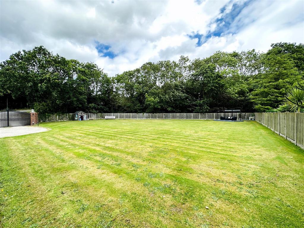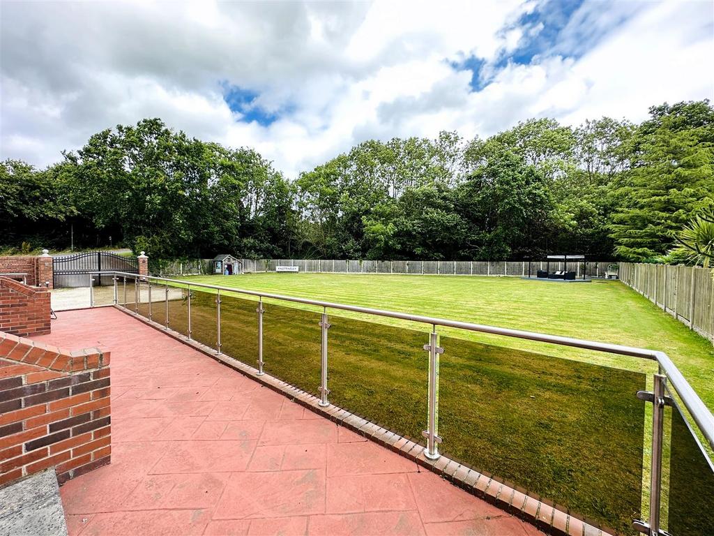 Exterior: Front - Flagged pathway leading away from the property, dividing the lawn into two sections, to decorative wrought iron pedestrian access gate. The boundaries are defined by decorative wrought iron metal work. Further pathway leading along the front of property, which in turn leads to additional decorative wrought iron pedestrian access gate giving access onto the driveway. This area is decoratively stoned and leads past the Garage to further tarmac driveway with decorative electric gates.