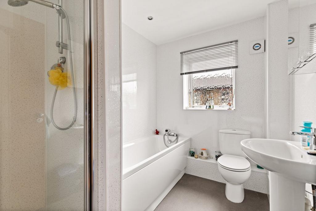 8' 1" x 6' 0" (2.46m x 1.83m) Modern suite with bath, separate shower, low level W.C., wash hand basin, heated towel rail and double glazed window.