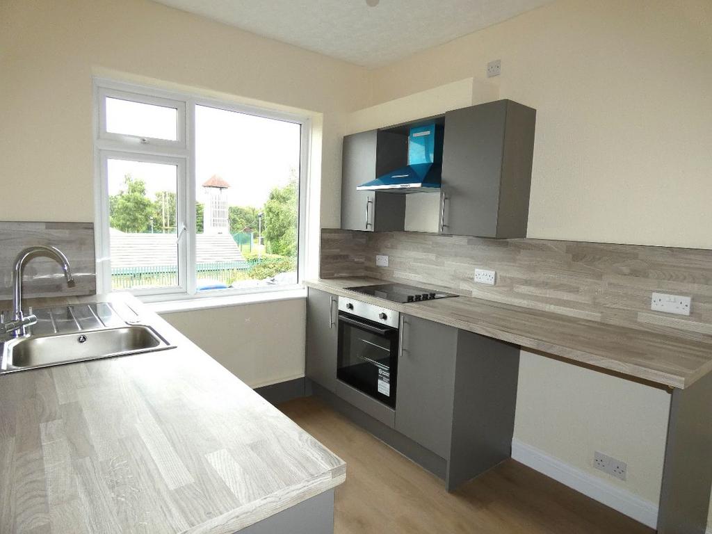 Modern base and wall mounted units, work surfaces with matching splashbacks, stainless steel sink unit with mixer tap, built in electric oven, four ring ceramic hob, chimney style extractor hood and plumbing for an automatic washing machine.