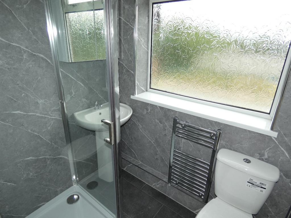 A modern suite comprising of a shower cubicle, pedestal wash hand basin and low flush w.c. Complimented with wall panelling, tiled floor and a heated towel rail.