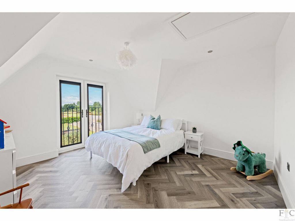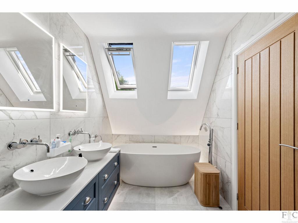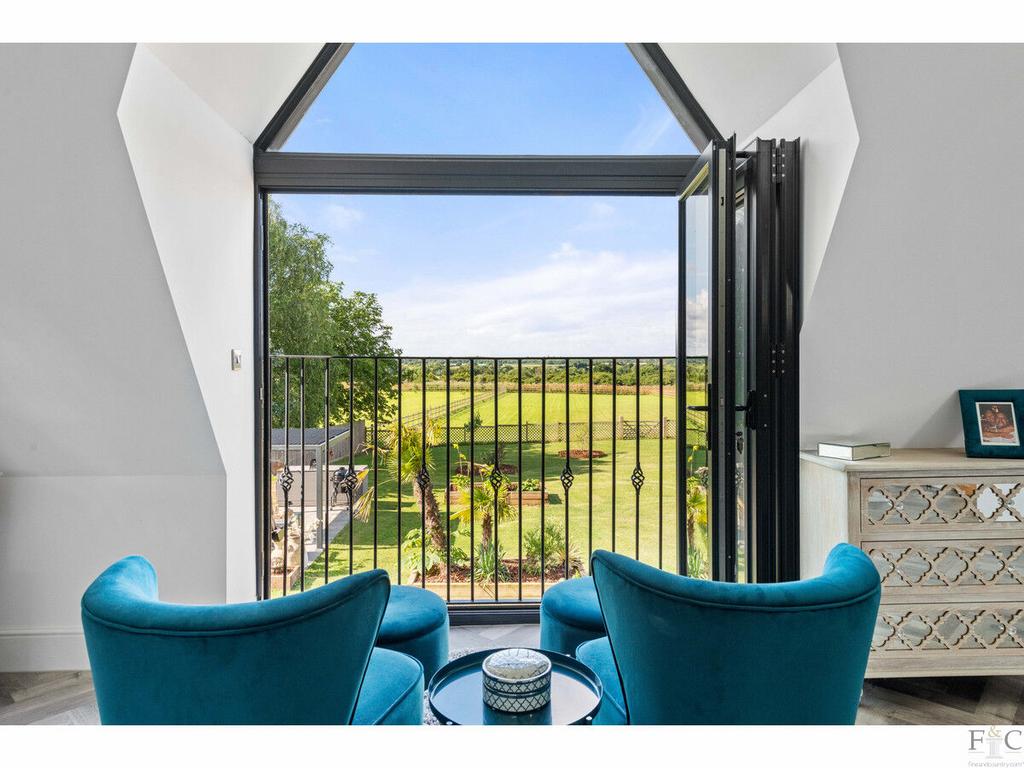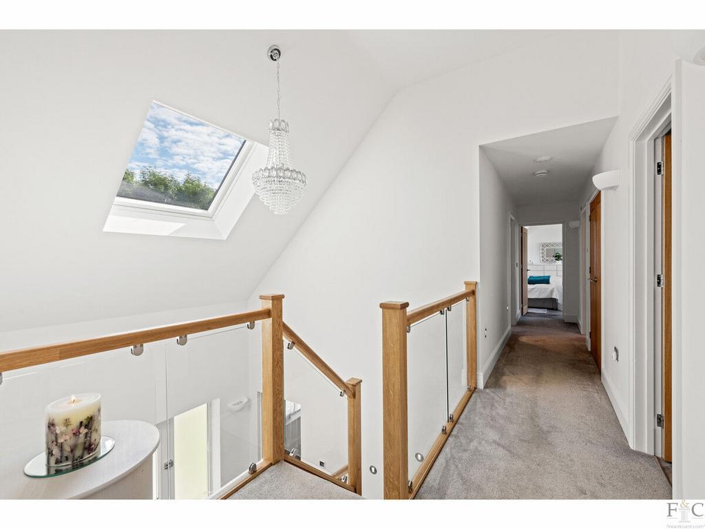 The first floor consists of a carpeted landing leading to the spacious primary suite of bedroom and ensuite, another four double bedrooms, two with ensuite bathing and finally, a large family bathroom. The spacious bedrooms have unique features dependent on size and shape. They all feature solid flooring and some have Velux windows in the elevated parts of the slanting walls and two of them, including the master room, have Juliette balconies overlooking the amazing views into the south facing garden and beyond. They are all tastefully decorated with coordinating fixtures and white painted walls.