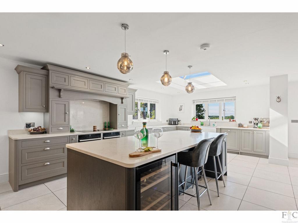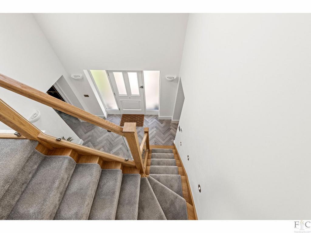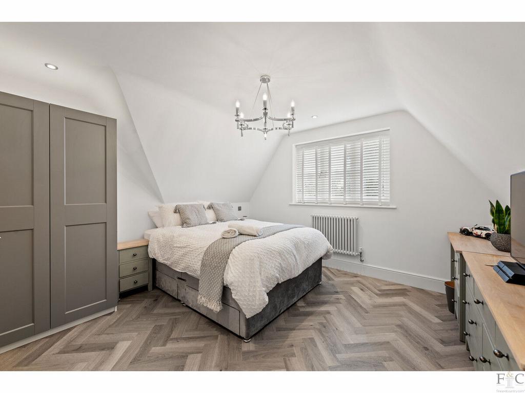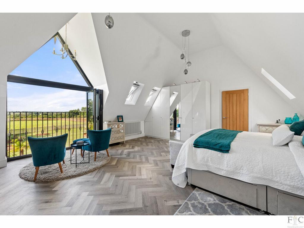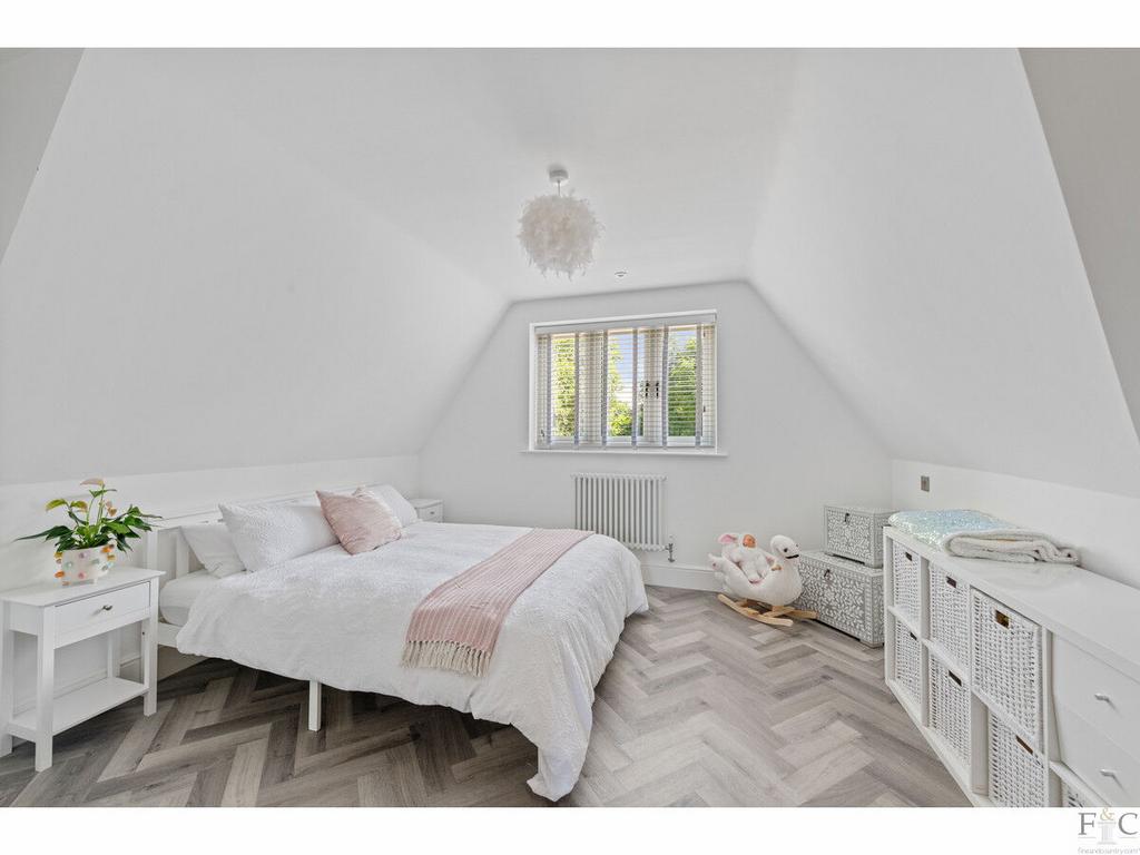 The first floor consists of a carpeted landing leading to the spacious primary suite of bedroom and ensuite, another four double bedrooms, two with ensuite bathing and finally, a large family bathroom. The spacious bedrooms have unique features dependent on size and shape. They all feature solid flooring and some have Velux windows in the elevated parts of the slanting walls and two of them, including the master room, have Juliette balconies overlooking the amazing views into the south facing garden and beyond. They are all tastefully decorated with coordinating fixtures and white painted walls.