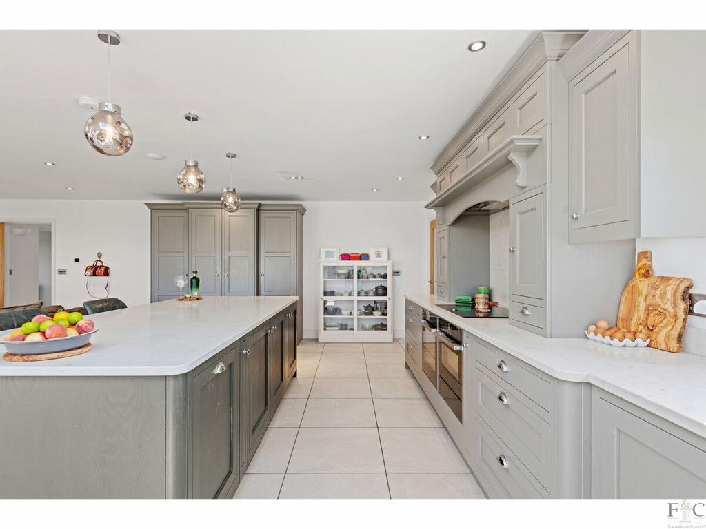 The natural materials and colours highlighted in the reception rooms continue here with large square floor tiles, white marble work surfaces and a mixture of Shaker style cabinetry, in contrasting white, light and dark grey to dramatic effect. Multiple wall and floor units provide ample, streamlined storage space. The central island feature and subtle lighting at floor, wall and ceiling level make this kitchen totally practical yet immediately striking. The integrated appliances bought in 2021 and included in the sale are an induction hob, double oven, fridge-freezer and dishwasher. The utility room immediately next door, provides additional storage, another sink, and plumbing for laundry appliances. There is also a door from the pantry leading to an entry into the rear garden and another allowing internal access to the double garage.