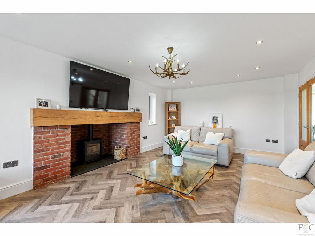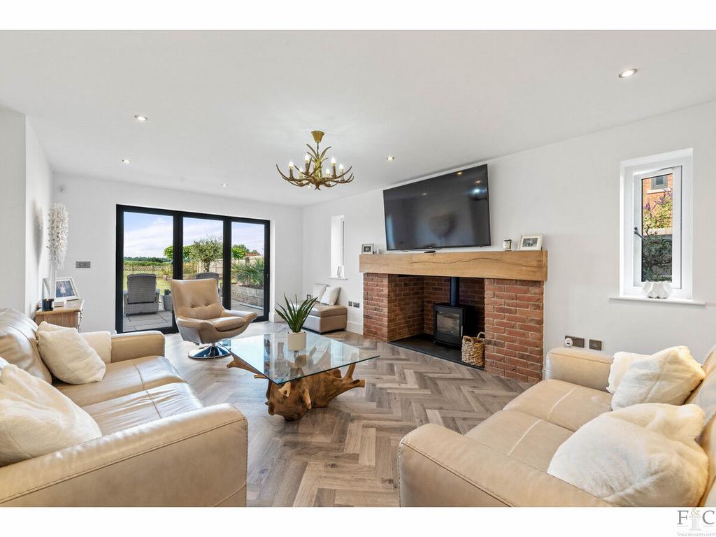 In the lounge there is a large multi fuel burner. This creates an impressive focal point. The fireplace is subtly simplistic, with slate tile hearth, exposed beam mantel and rustic brick supporting columns. This spacious and stylish room has the characteristic herringbone patterned hard flooring and looks out to the south facing garden and beyond, accessible through bi folding door to the patio. From the garden there are wide open views over the natural landscape of farmland and trees.