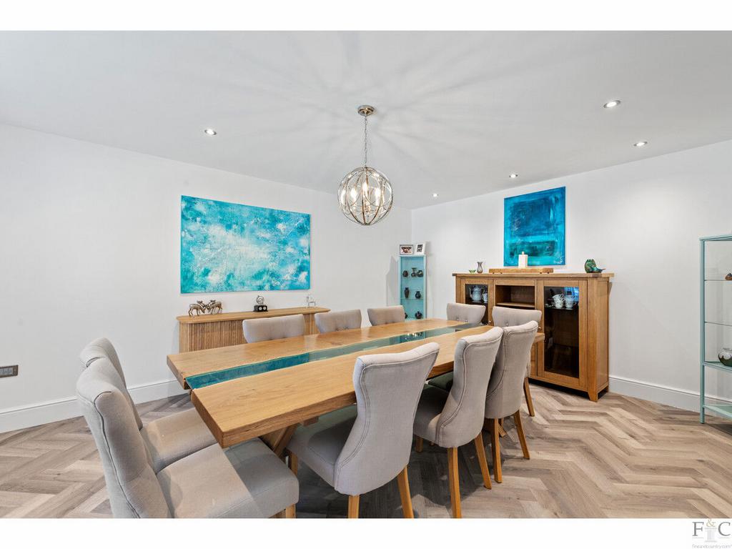 The Paddocks has been fitted with underfloor heating and has solid floors throughout the ground floor. It benefits from lighting that can be altered to suit the mood and occasion. The dining room is one of several entertaining areas and is generously proportioned to easily hold several large pieces of furniture. It has a window overlooking the front drive. Across the hall the study has been fitted out to suit its purpose with hard flooring and space for storage and technical equipment. It is also facing the front of the property and is next door to the lounge.
