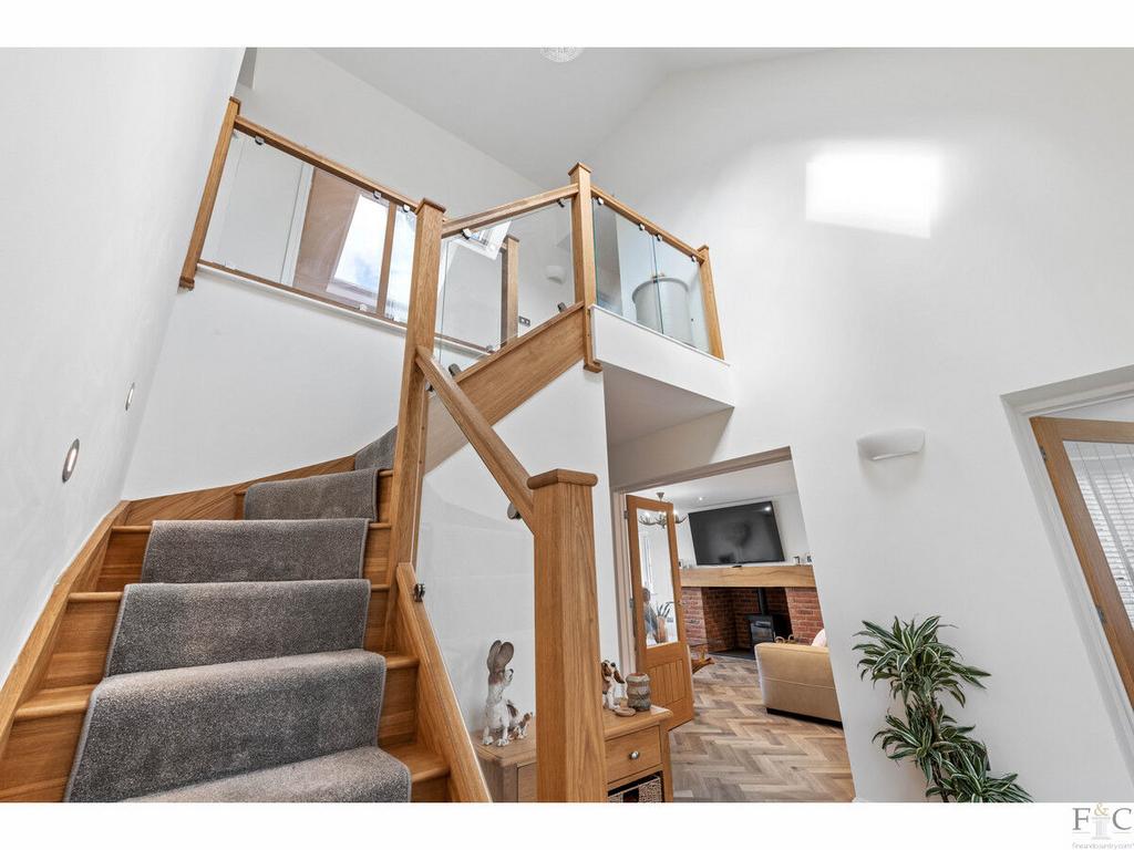 The translucent glass panelled front door is under a covered porch featuring naturally stained timbers and the windows are painted aluminium frames with stone ledges. Once inside, the striking facets of the interior decoration provide a neutral canvas: predominantly white, with medium oak and glass. These design aspects will reappear throughout the house and provide a coordinated and contemporary feel to the entire property. The light and airy hall sets the standard with a modern staircase, herringbone patterned floor tiles, and medium oak tongue and groove doors, with brushed steel accessories. Oak and transparent glass lead the eye to the galleried landing on the first floor, where light flows through one of several skylights and the carpet runner is followed in parallel with subtle floor level lighting. A cloakroom and store are positioned under the stairs and doors open to reception rooms on all sides: clockwise opening to the dining room, open plan kitchen/diner, lounge and finally, study.