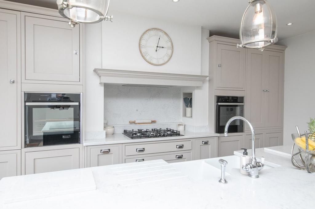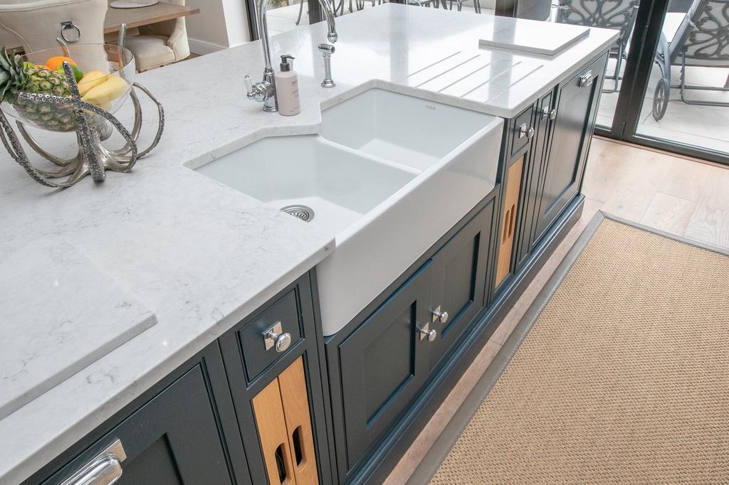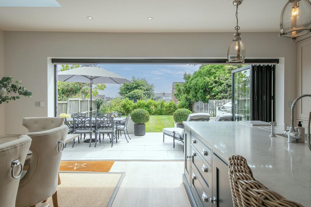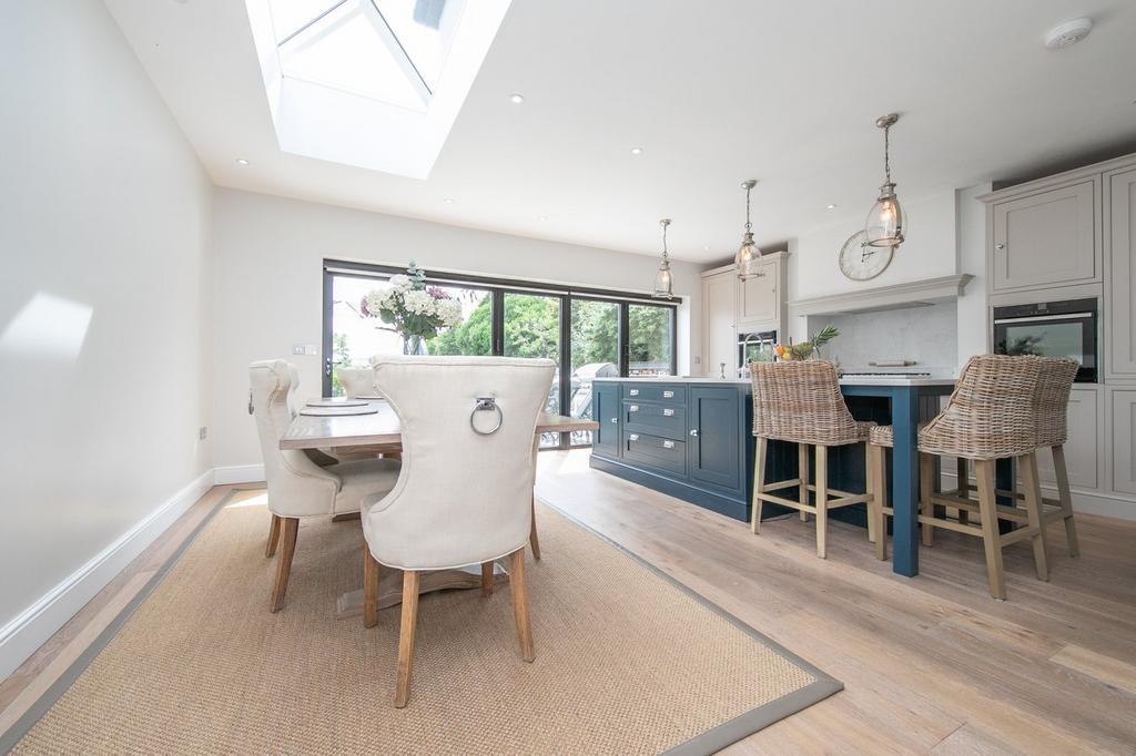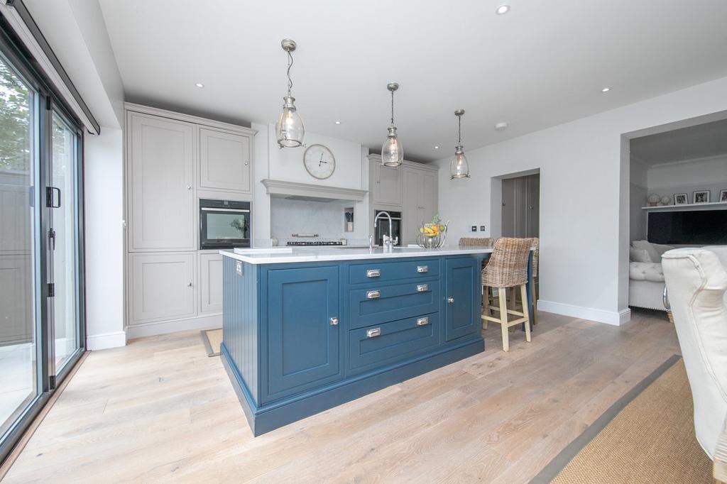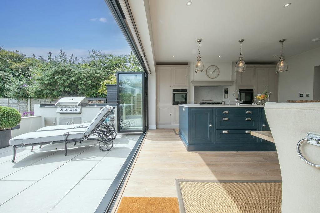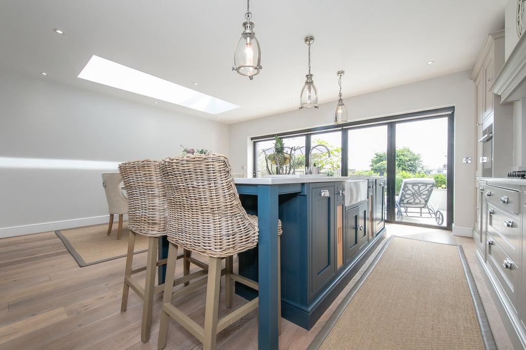 19' 08" x 15' 04" (5.99m x 4.67m) Aluminium bi-fold door with electric fitted blind to rear, aluminium roof lantern, engineered oak flooring, underfloor heating, inset spotlights and pendant feature lights, wall mounted hive thermostat, open plan kitchen dining space with fitted in frame contrasting kitchen, including a range of base units and drawers, breakfast cupboard housing Neff microwave, integrated Neff five ring gas burner hob, extractor hood, two slide and hide ovens, full length fridge and dishwasher, island with quartz worktops, space for breakfast stalls, butler style sink with Perrin & Rowe Instant hot water tap with rinse function.