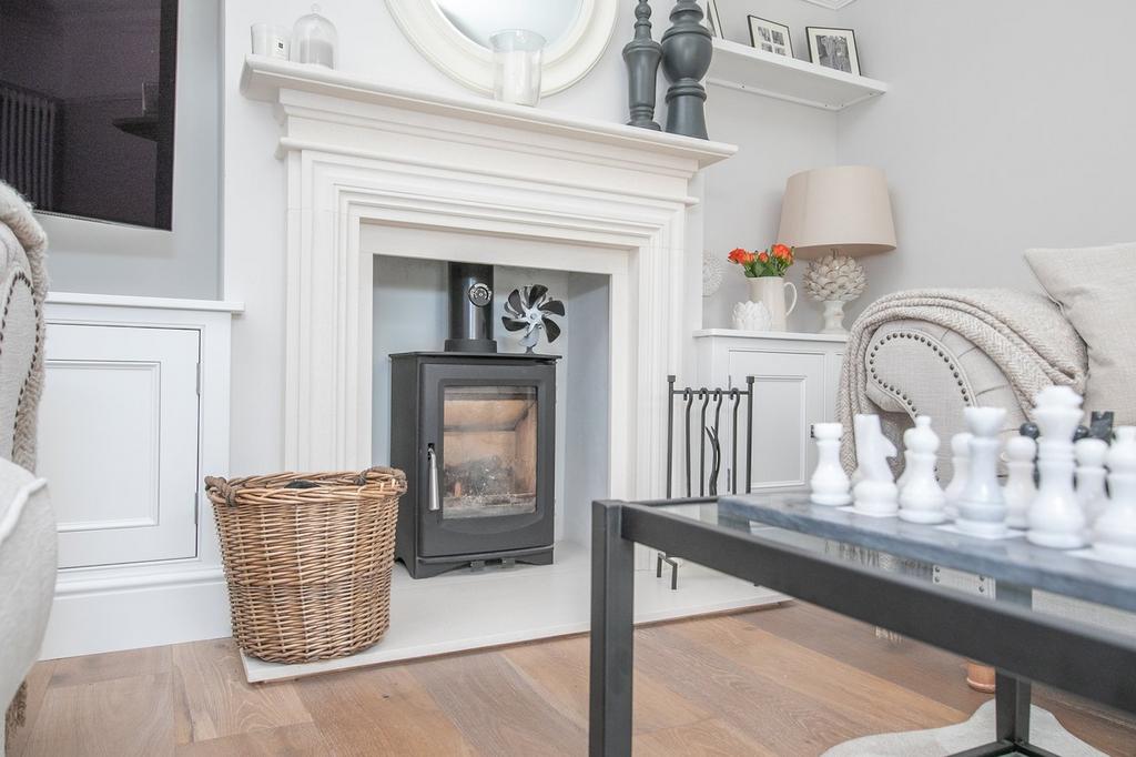 13' 01" x 11' 02" (3.99m x 3.40m) Engineered oak flooring, vertical column wall mounted radiator, picture rail, bespoke fitted alcove unit with shelving above, limestone fireplace with log burning stove.
