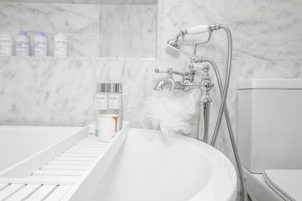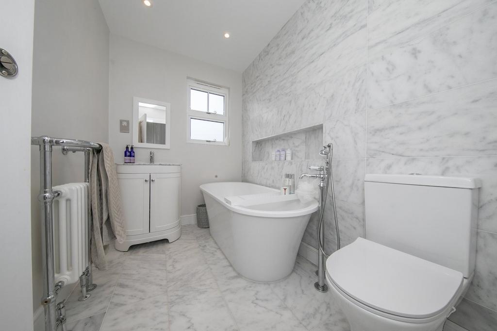 Double glazed obscure Aluminum window to side, inset spotlights, marble flooring and feature wall, column towel radiator, freestanding bath and tap, level WC, vanity unit wash hand basin and ceiling extractor fan.