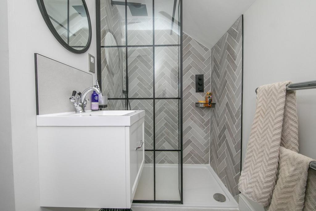 Inset spotlights, porcelain floor tiles, column towel radiator, double length walk in shower with porcelain herringbone splashback, wall mounted sink, low level WC and ceiling mounted extractor fan.