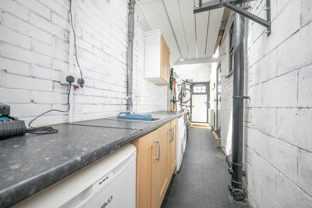 23' 11" x 4' 09" (7.29m x 1.45m) Velux windows to ceiling, wall mounted lights, radiator, a range of wall and base units, laminate worktop, stainless steel sink with right hand drainer, space for washing machine, fridge freezer, tumble dryer along with storage for bikes or similar.