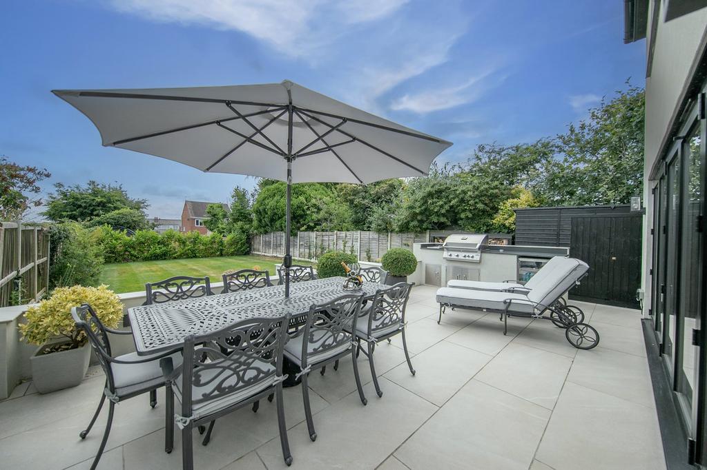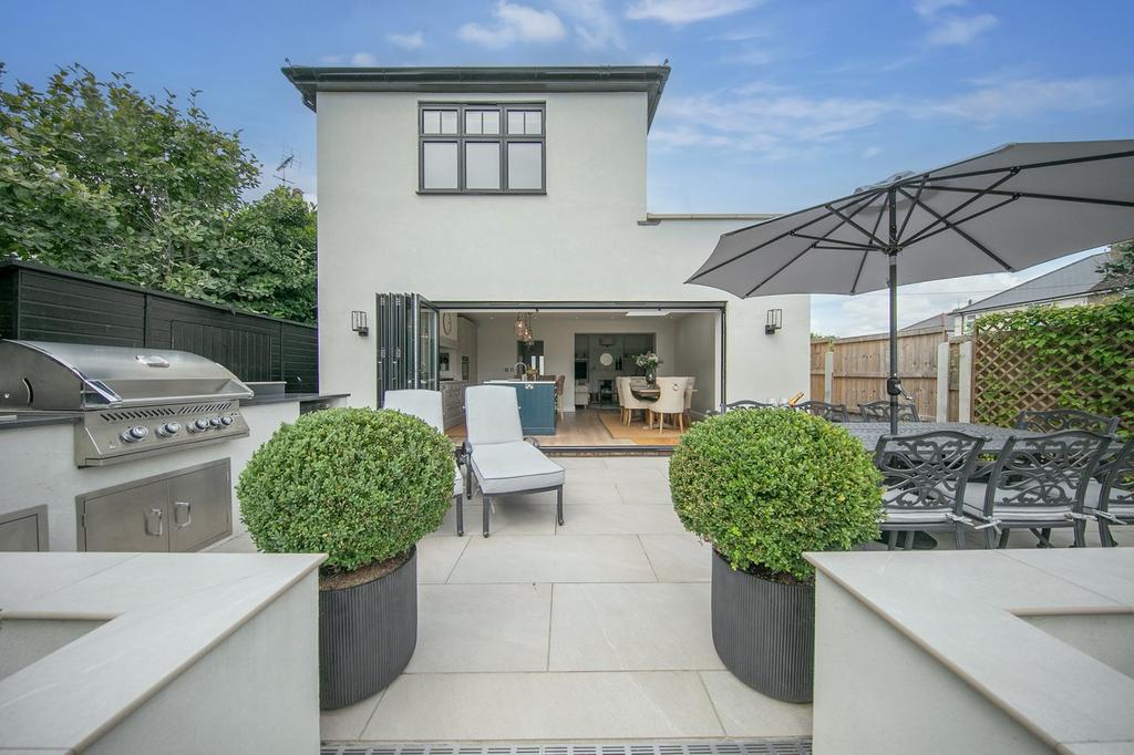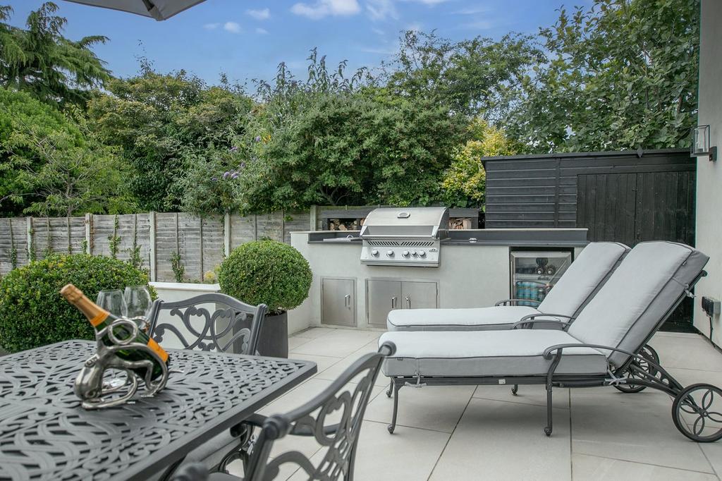 A beautiful south facing rear garden approximately 80ft long, recently landscaped including Italian porcelain patio with bespoke fitted outdoor cooking area including granite worktop, stainless steel units, Napoleon barbecue with side burner and space for drinks fridge, stepping down onto the well established lawn retained by fencing, mature shrubs and hedging, garden shed, outside tap and sockets and access to lean to.