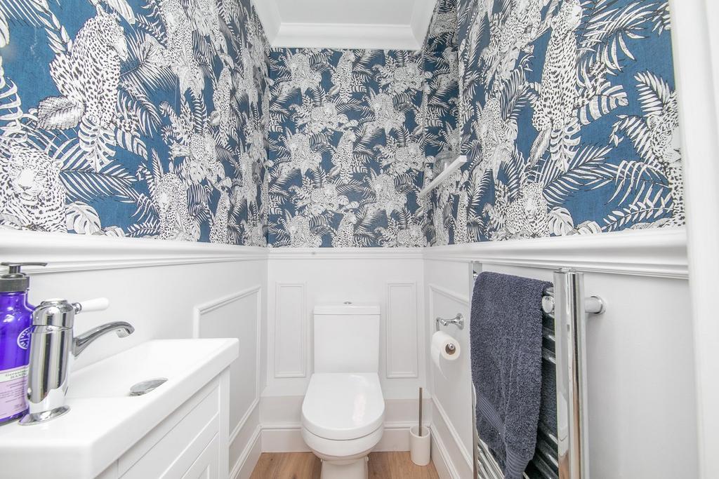 4' 09" x 3' 2" (1.45m x 0.97m) Double glazed aluminium obscured window to side, inset ceiling lights, engineered oak flooring, ceiling mounted extractor fan, towel rail, panelling to walls, low-level WC and vanity unit basin.