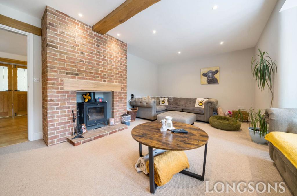 Feature inglenook style brickwork fireplace with inset log burning stove, walk-in UPVC double glazed bay window to front.