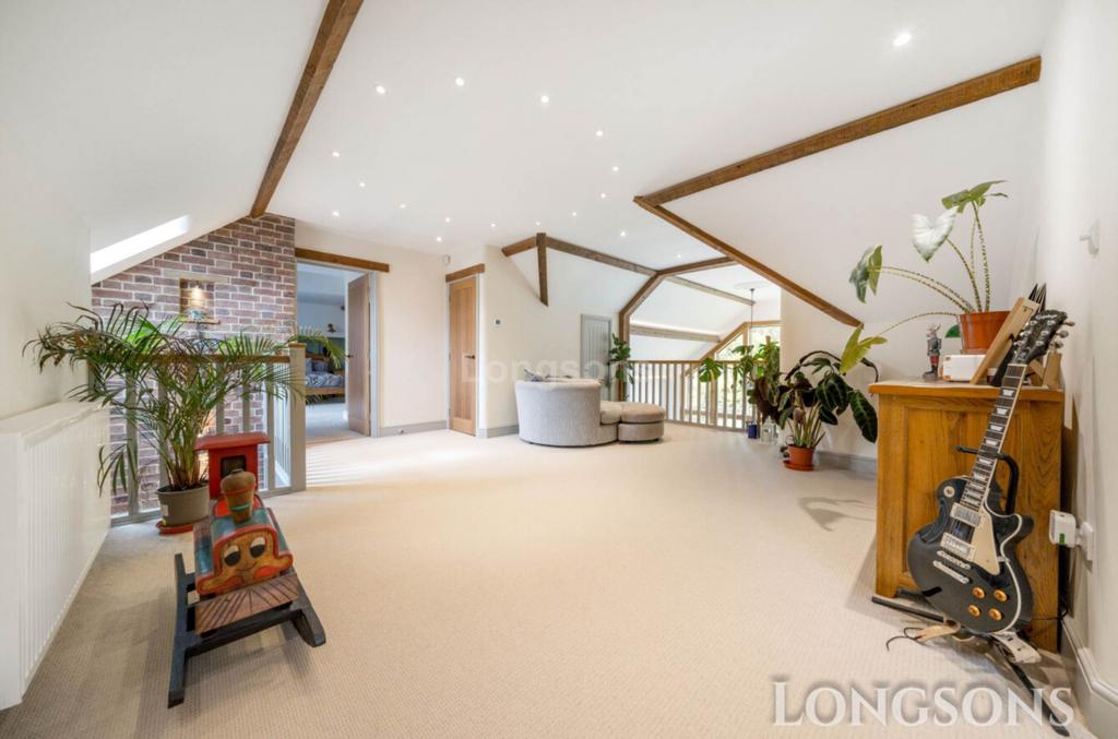Large galleried landing with sitting/study area, two built-in eaves storage cupboards, built-in cupboard housing hot water cylinder, exposed wooden beams to ceiling.