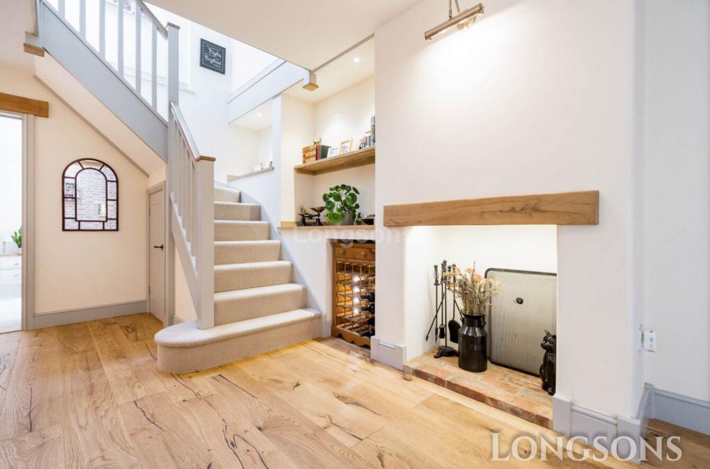 Composite entrance door to front, feature fireplace (not in use) stairs to first floor, understairs storage cupboard, engineered oak boards to floor.