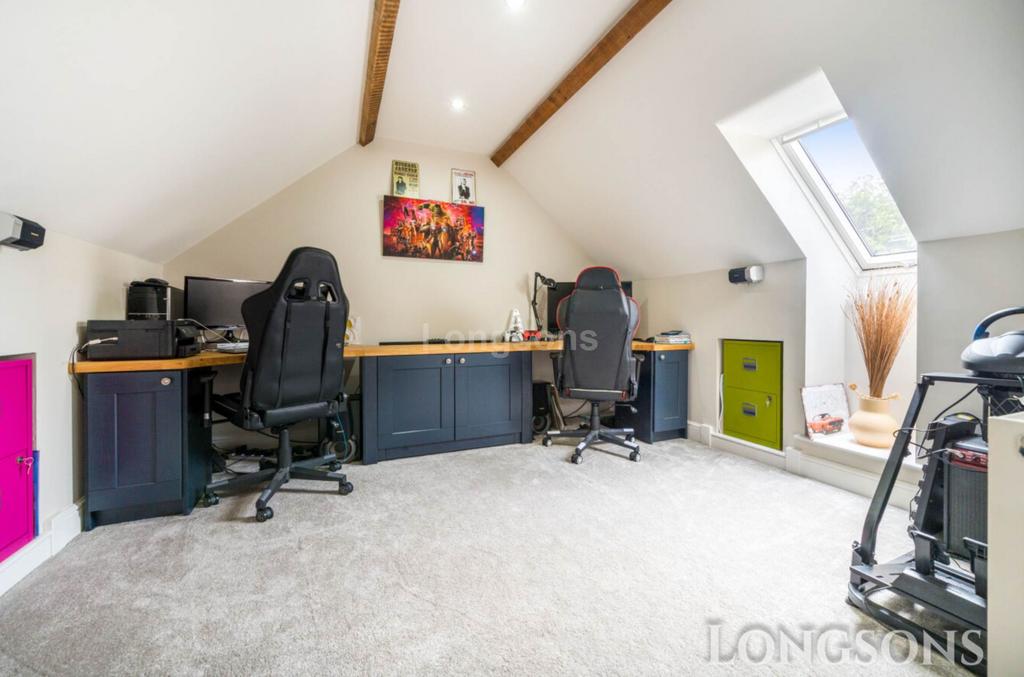 Fitted desk & storage units, double glazed Velux window to side, exposed beams to ceiling, fitted shelving to alcove, radiator, door to eaves storage.