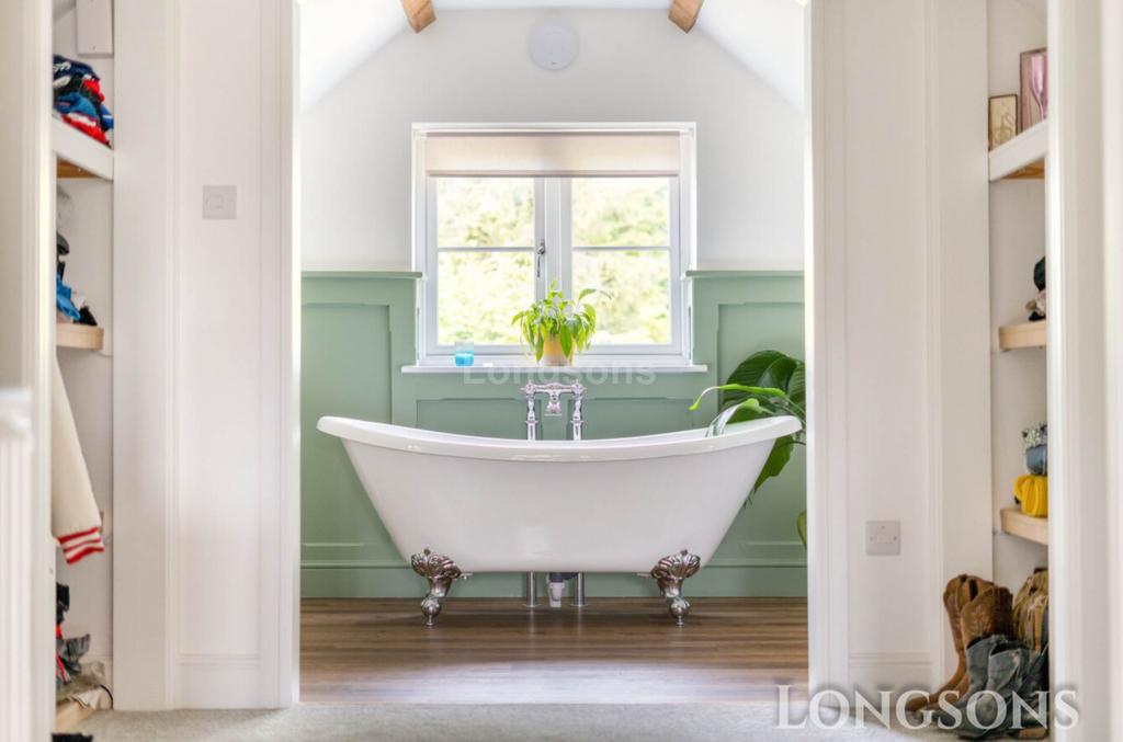A large bedroom with LED illuminated built-in wardrobe, dressing area with clothing racks and shelving, exposed beams to ceiling, arched opening through to bath area with freestanding double ended roll top bath with centrally mounted mixer tap, two towel radiators,