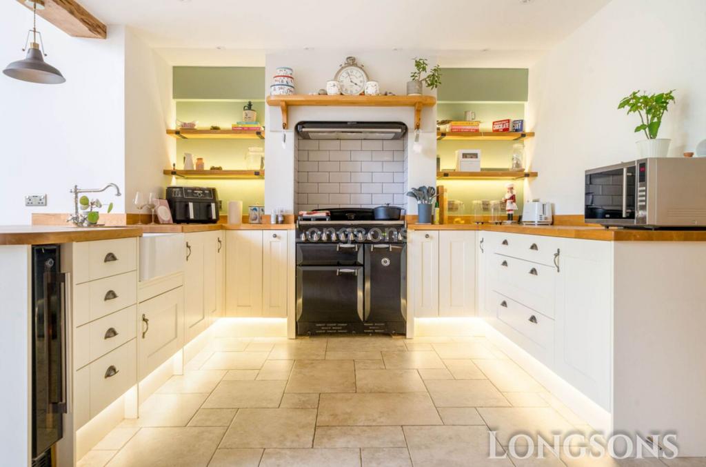Range of fitted kitchen units to walls and floor complemented by an oak work surface over and ceramic butler style sink unit with mixer tap, large range style electric oven with lpg gas hob and extractor hood over, integrated wine chiller, integrated dishwasher, a second ceramic butler style sink unit with retractable mixer tap, built-in wardrobe, space for large American style fridge/freezer, tiles to floor.