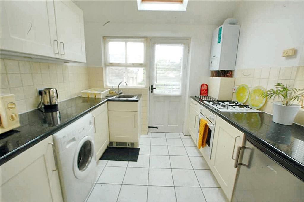 8'10" x 7'7" (2.69m x 2.34m) window and part glazed door to rear, range of modern fitted wall and base units incorporating built-in electric oven and gas hob with extractor, one and a half bowl sink, plumbing for washing machine, floor and wall tiling, modern Vaillant gas boiler.