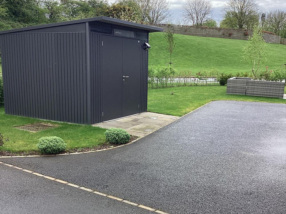 - Large metal storage shed 10ft x 8ft (3.04m x 2.43m), with lighting and power.