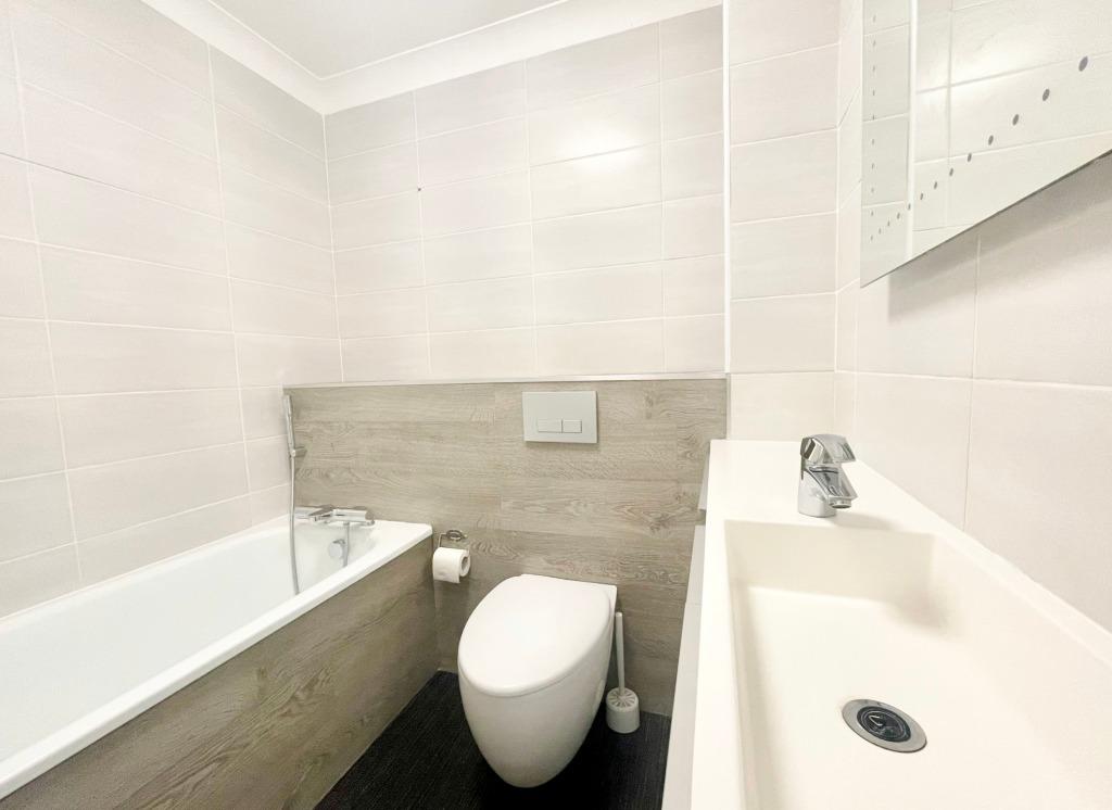 This apartment offers contemporary design throughout yet retaining many period features including high ceilings, deep skirting, cornicing and period fireplace in the living room.