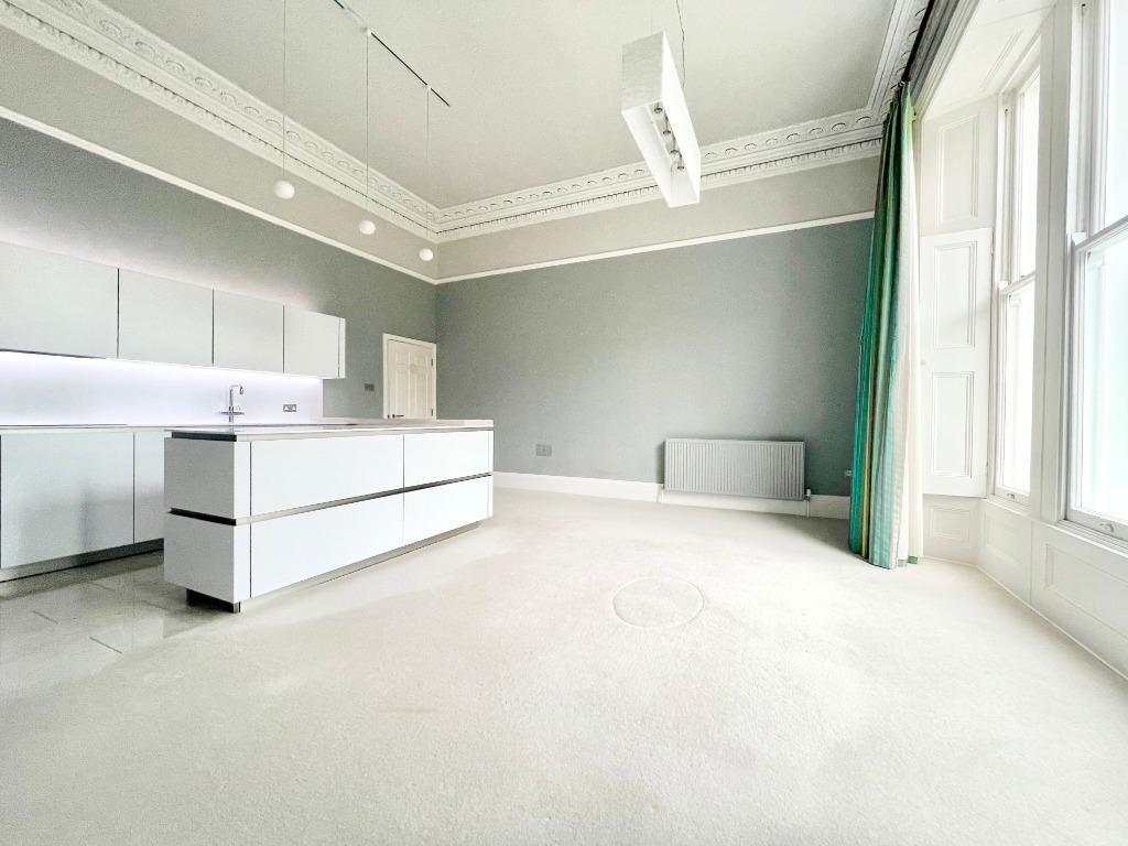 The unfurnished, luxurious accommodation provides, steps up to a private entrance which opens to a good-size reception hall. Generous size kitchen/ dining room with three-quarter length sash window with working shutters and display alcoves either side. The bespoke fitted kitchen with corian worktop and breakfast bar of Swedish river washed wood provides a range of base and wall units equipped with double oven, induction hob, diswasher, fridge & freezer. From the dining area double doors open to an elegant reception room with two three quarter length sash windows to front with shutters, high ceiling and cast iron fireplace with mantle and surround. The apartment further provides two double bedrooms, main bedroom with en-suite shower room with double size shower cubicle and plumbed washing machine. There is also a family bathroom with fitted white suite.