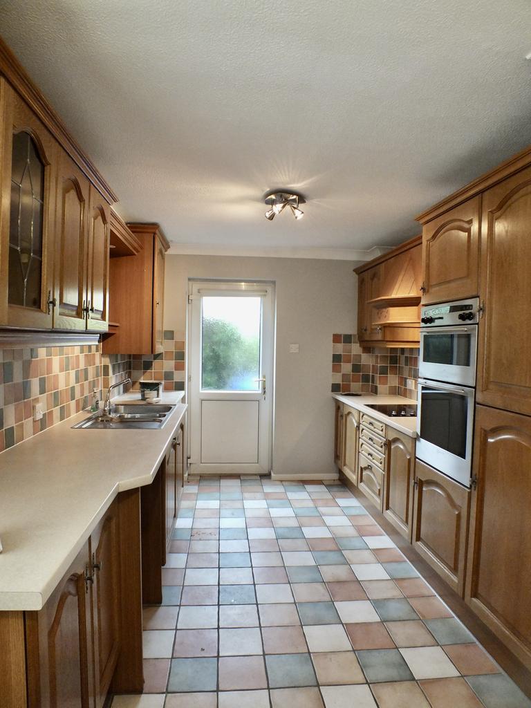 Range of matching base and wall cupboards. Working surfaces with inset one and a half bowl sink unit with mixer tap. Electric hob, double oven and built in fridge/freezer. Extractor fan. Tiled floor. Door to garden.