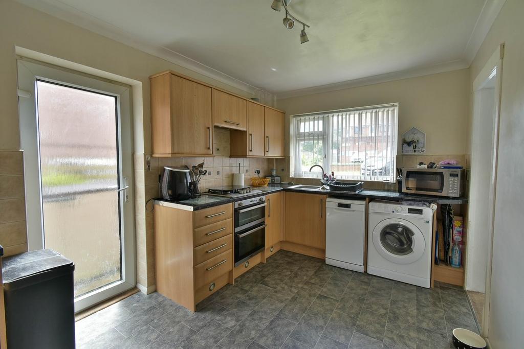 13' 10" x 8' 7" (4.22m x 2.62m) Comprising one and a half bowl stainless steel sink unit with mixer tap with cupboard under, plumbing for washing machine and dishwasher, range of working surfaces with cupboards and drawers under, built in four ring gas hob with double electric oven below, extractor hood over, matching wall mounted cupboards to either side, low level lighting, space for American style fridge freezer. Further corner working surface with cupboard under and matching wall mounted cupboards over, part tiled walls, double glazed door, giving access to the side, radiator, double glazed window overlooking the front of the property, and large under stair storage cupboard.