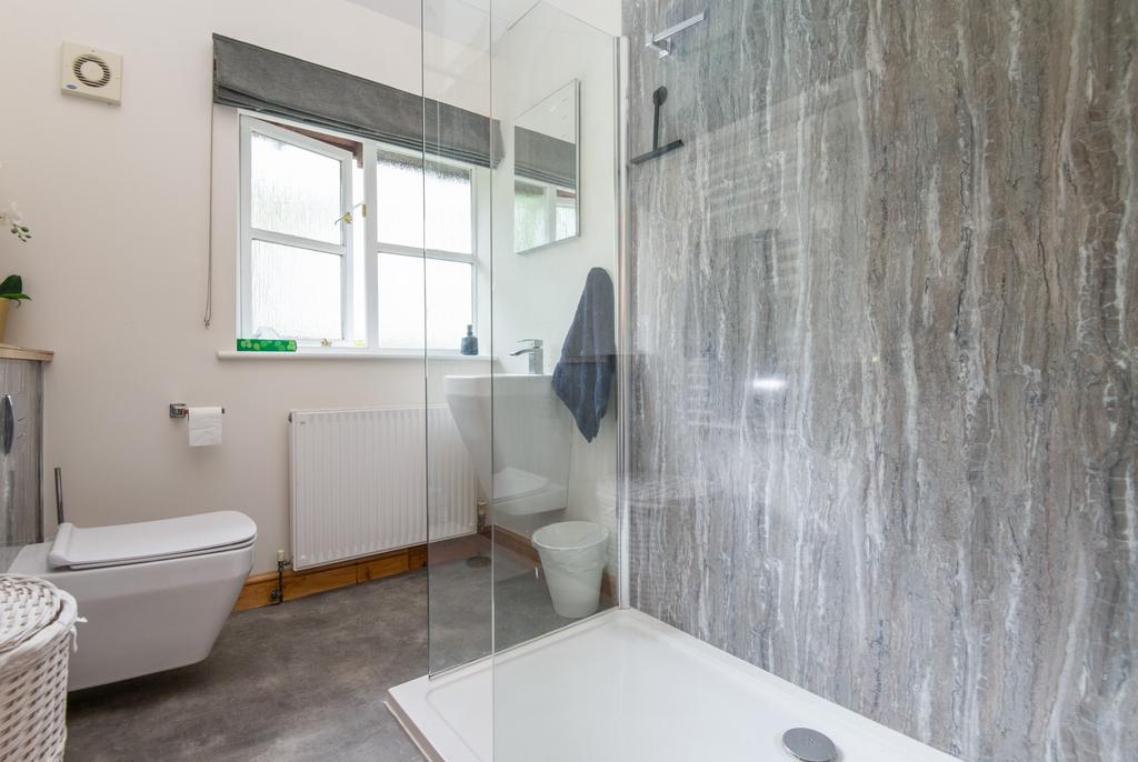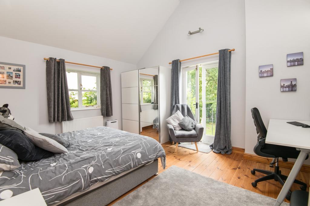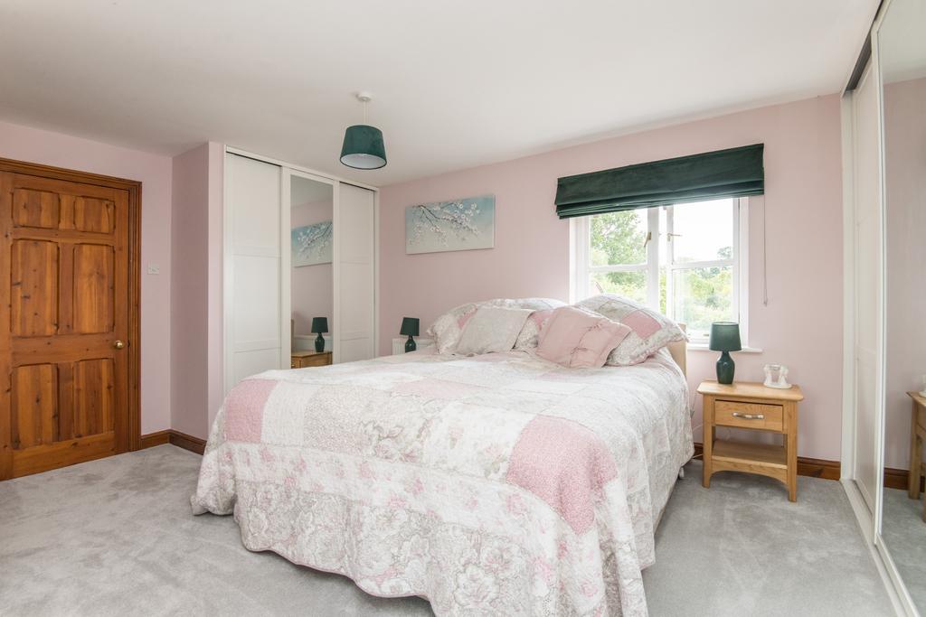 The first floor has an extensive landing which, because land rises to the rear of the property, has French doors opening to the rear garden patio. The landing is large enough to provide a study area overlooking the garden and also includes a very large airing cupboard and a storage cupboard with access to the loft. The master bedroom has a dual aspect and a vaulted ceiling with exposed beams and an ensuite shower room. The guest bedroom offers a double aspect overlooking the gardens, extensive built-in wardrobes, and a beautifully appointed ensuite shower room with a large walk-in shower. Bedroom three has a dual aspect and a vaulted ceiling plus a Juliet balcony overlooking the garden. There are two further bedrooms and a further superb shower room.