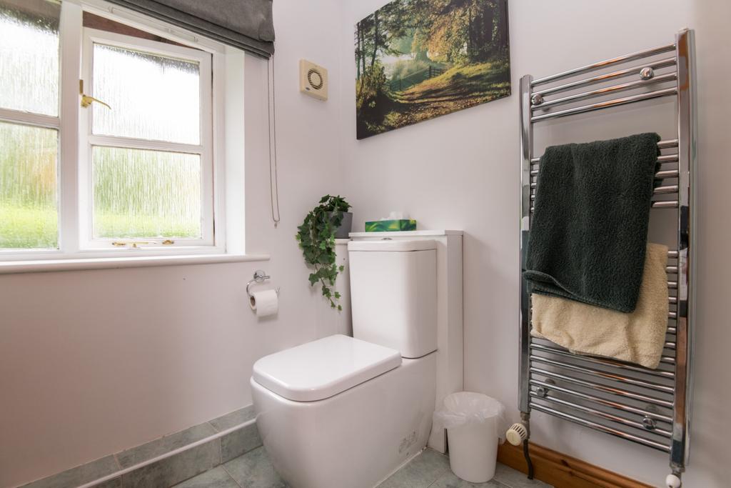 To the rear of the property is a good-sized and mainly lawned garden which backs onto fields and which is ideal for children and pets. Mature shrubs and hedging, a climbing rose and patio with raised borders and outside lighting. Steps lead down to a path which connects the gardens on either side of the house via a wrought-iron gate.