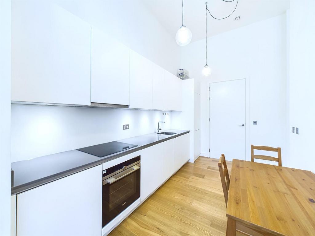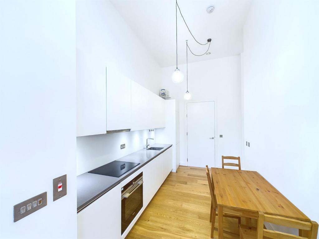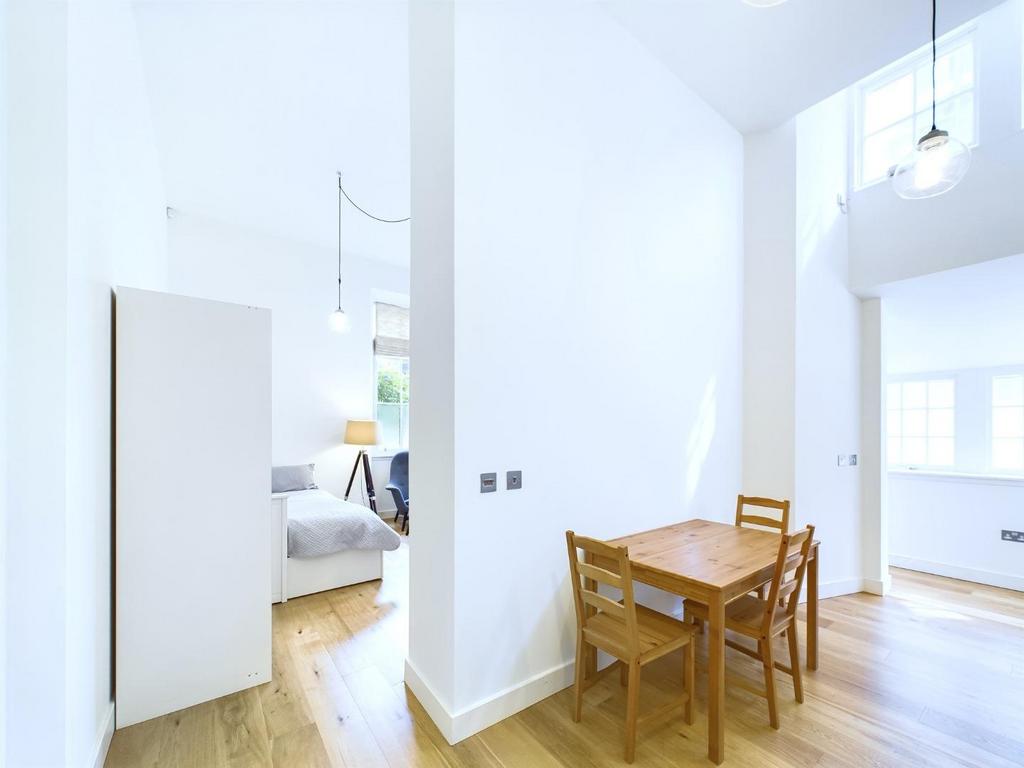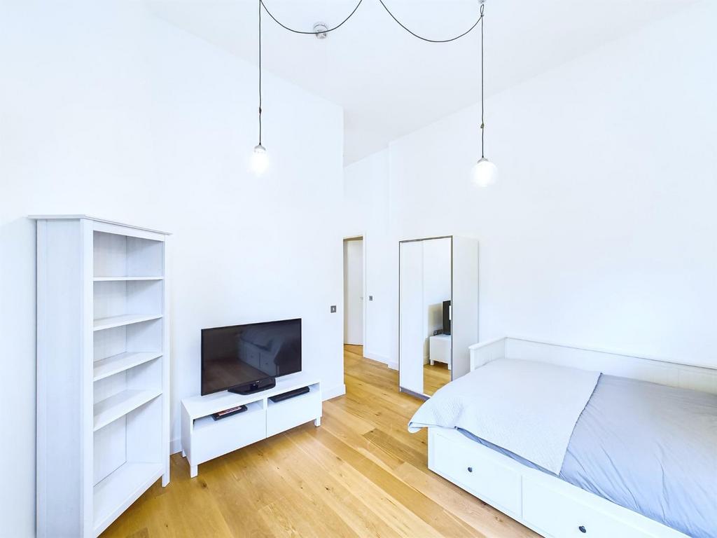 To the left of the kitchen, you'll find the combined living and bedroom area, thoughtfully designed to maximize space and comfort. The high ceilings and large modern sash and case windows enhance the room's openness, while the LVT wood flooring adds a touch of elegance. This area is well-spaced, providing ample room for relaxation and rest, benefiting from the same bright and airy feel that permeates the entire apartment.