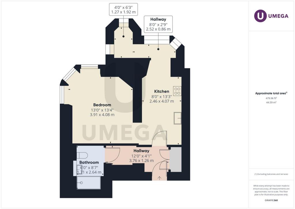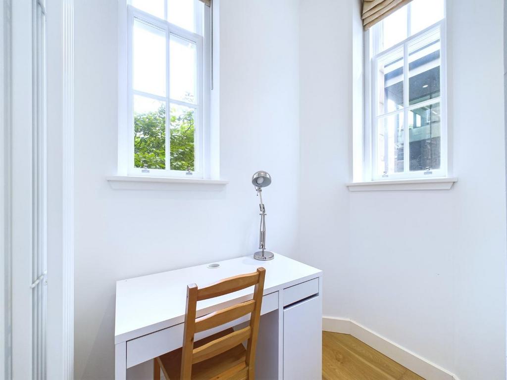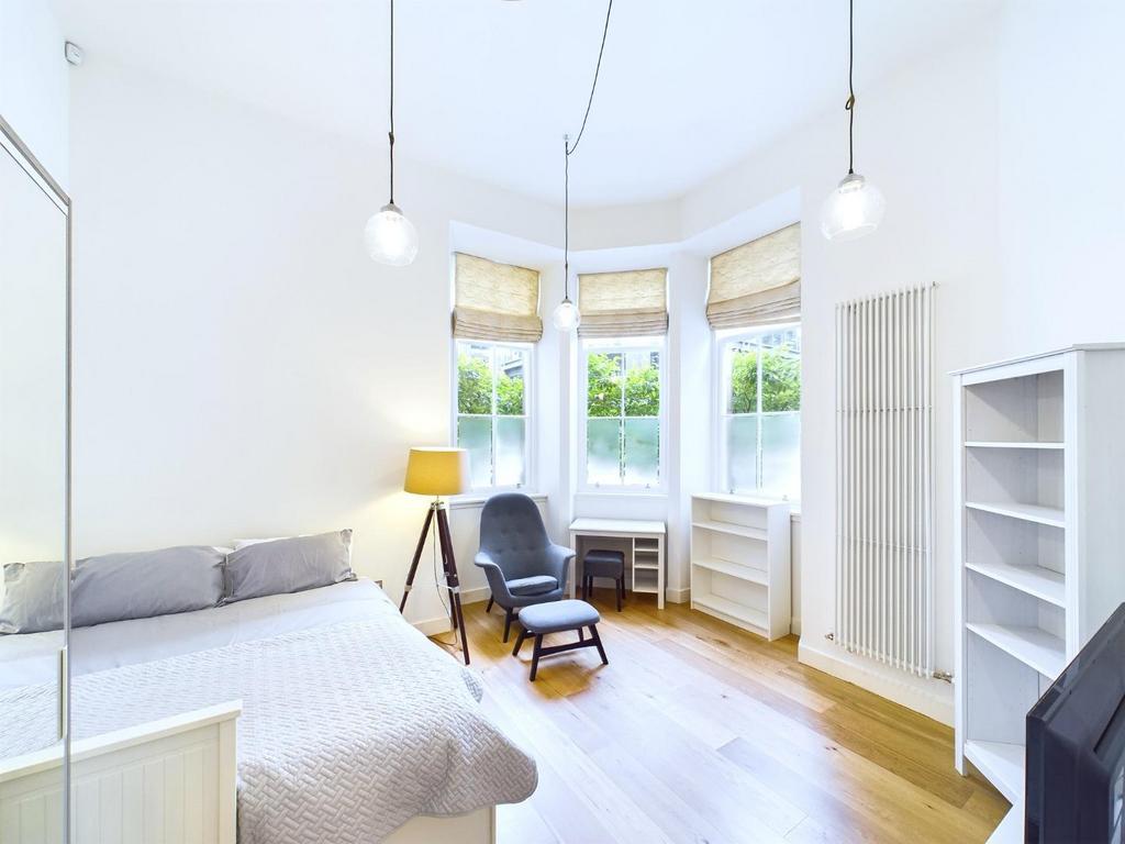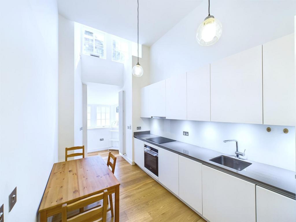 To the left of the kitchen, you'll find the combined living and bedroom area, thoughtfully designed to maximize space and comfort. The high ceilings and large modern sash and case windows enhance the room's openness, while the LVT wood flooring adds a touch of elegance. This area is well-spaced, providing ample room for relaxation and rest, benefiting from the same bright and airy feel that permeates the entire apartment.