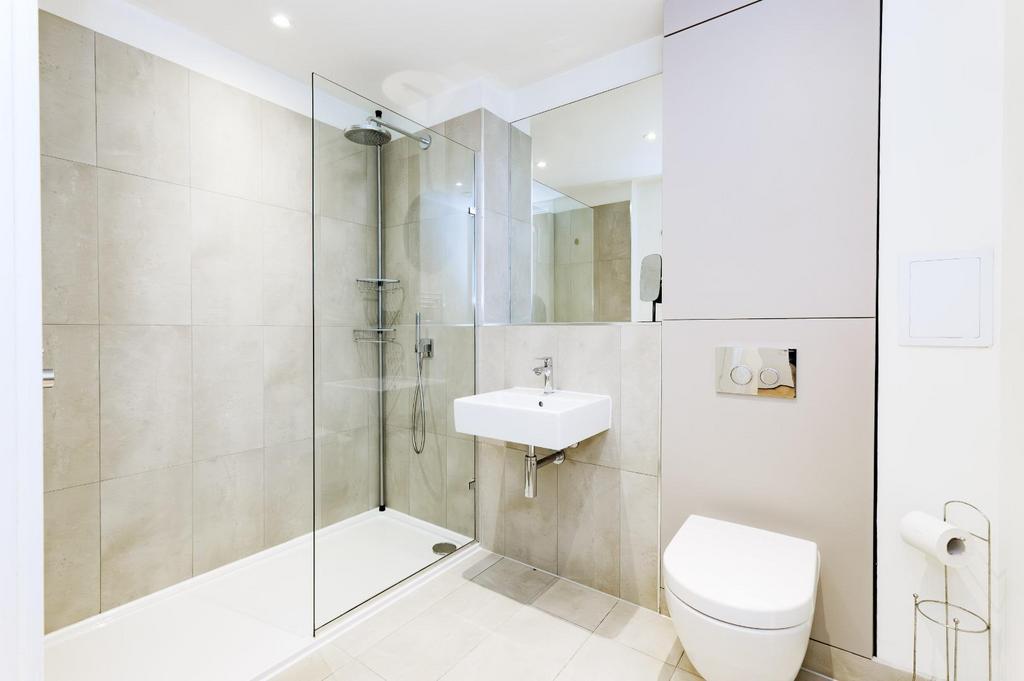 As you enter the property, you are greeted by a modern and sleek bathroom to the left of the hallway. The bathroom features floor-to-ceiling tiles, a walk-in rainfall shower, an integrated sink and W/C, and a towel radiator, offering a contemporary and luxurious feel.